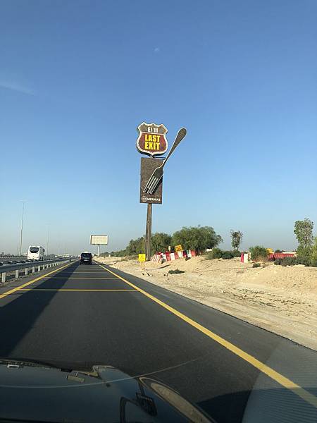 杜拜國際機場到阿布達比,只要走高速公路E11就對了,他們就一條高速公路通到阿布達比。如果中途不休息,大約一個半小時就會到達阿布達比,但我們設定的第一站是『Last Exit高速公路休息站』,它位在前往阿布達比的路上,因為有著很有個性的裝潢佈置,又可以停車休息,所以變成了我們到達杜拜後的第一個景點囉!