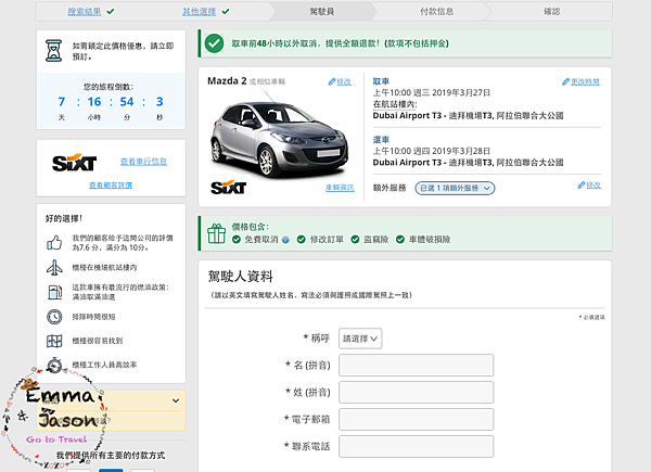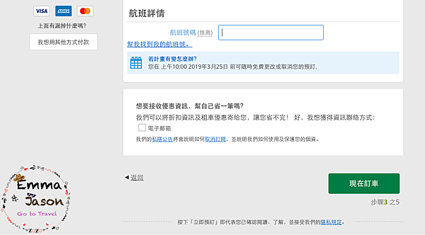 下一頁填寫資料,還有確定取車及還車地點喔!別忘了航班也要填一下,這樣如果班機有延遲他們也會知道的!
