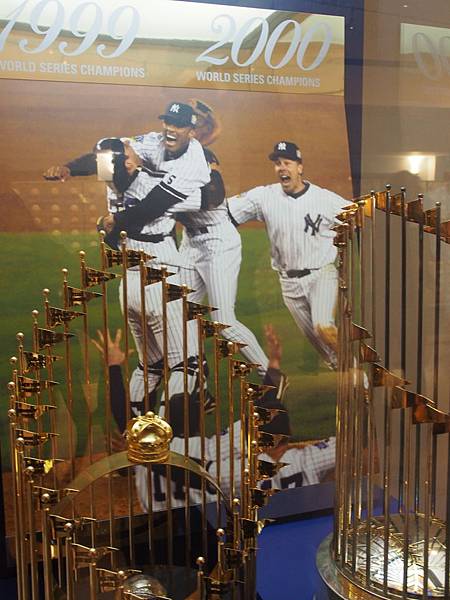 第一站是洋基球場裡的小博物館,首先映入眼簾的是一面簽名牆,牆頂就是一顆快速直球從投手手裡竄進捕手手套所拉出完美弧線!當然,這面簽名牆兩端的投捕搭檔可不是隨便人能擔任的, 擔任投手的是Don Larsen,在另一側則蹲捕的則是Yogi Berra,在1956年兩人搭配合演了目前MLB史上唯一一場世界大賽的完全比賽
