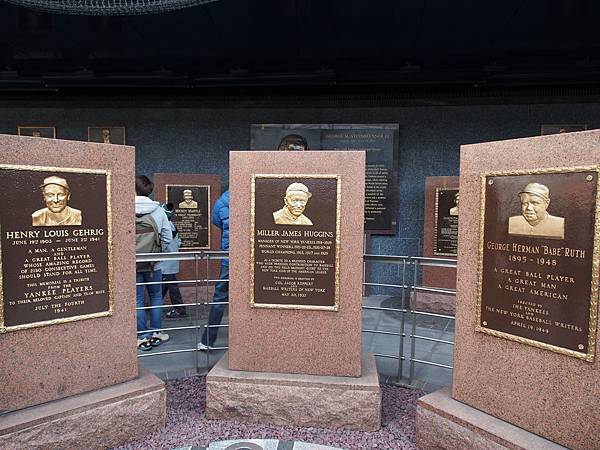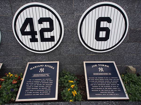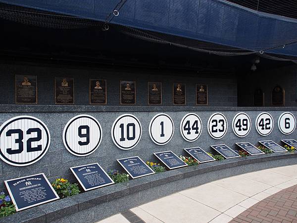 第二站來到的這一區,雖然看起來有點像墓仔埔......(汗),但其實是洋基球場外野後方的紀念碑公園,這些都是對球隊有著偉大功績的球員紀念碑還有他們的球衣背號,為了感謝球員的功勞,這些背號都是退休背號,以後的人都不能再使用這些號碼囉!